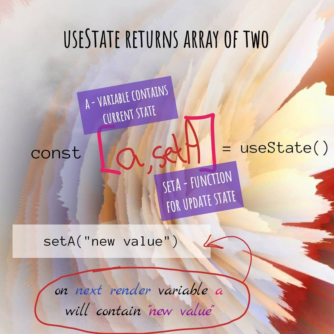 Вызов useState вернёт нам массив из двух элементов — в первом будет храниться текущее состояние, во втором — функция, вызвав которую мы можем обновить это состояние.