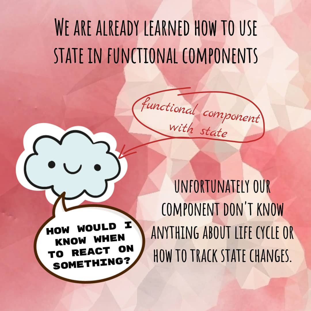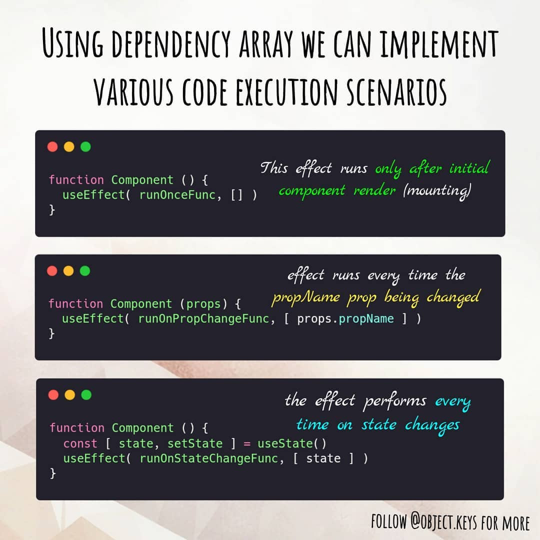 В остальных случаях мы можем следить за изменением состояния, пропсов, коллбэков и мемоизированных данных (useCallback/useMemo будут рассмотрены дальше), и каким–то образом реагировать на них.