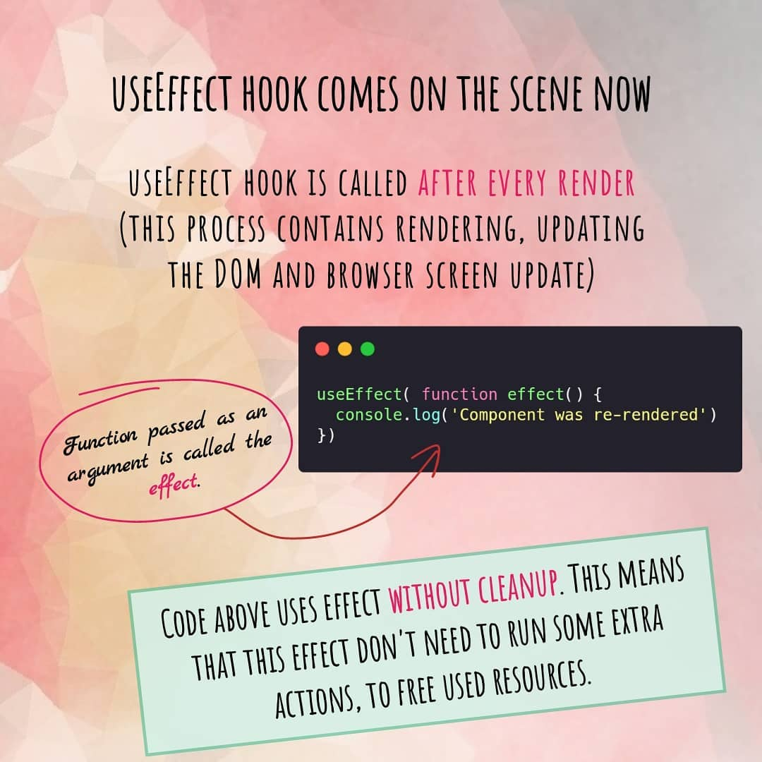 Самый простой случай — когда хук реагирует на каждый рендер компонента. Для этого мы просто вызываем useEffect с функцией обратного вызова в качестве аргумента (функция–эффект) — эта функция и будет вызываться после каждого рендера компонента.