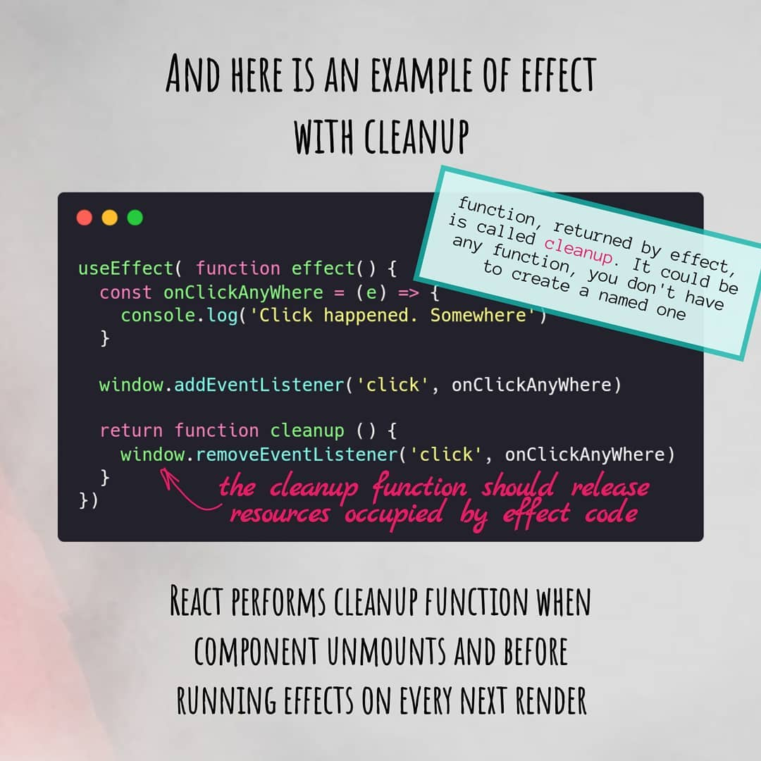 Всё дело в том, что функция–эффект может возвращать ещё одну функцию, так называемую, функцию сброса (cleanup), которая будет вызвана перед откреплением (unmount) компонента.
