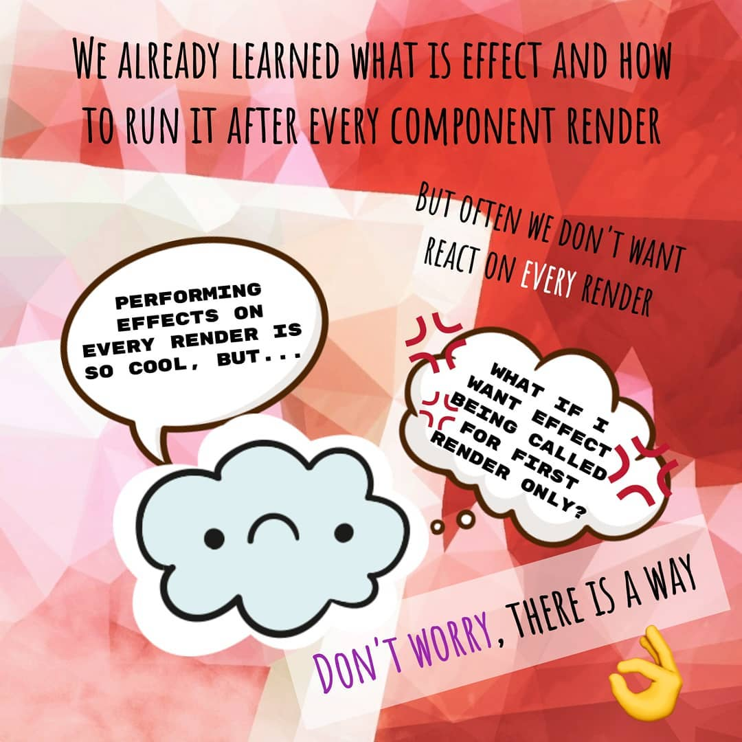 Как несложно понять, useEffect с единственным аргументом не так уж и полезен — гораздо чаще этот хук используется с двумя аргументами — функцией–эффектом и массивом зависимостей.
