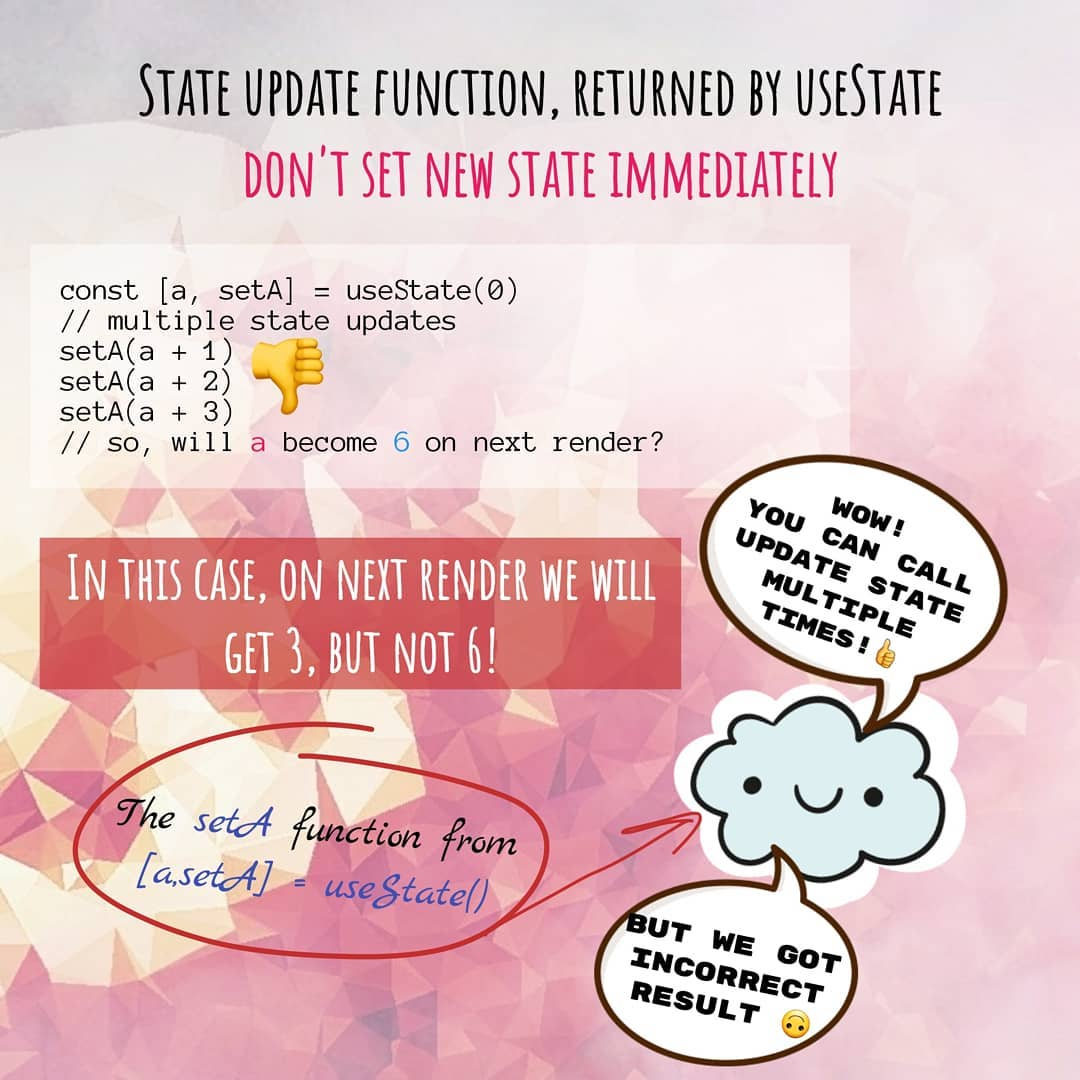 Иногда может потребоваться обновить состояние несколько раз подряд — никто не запрещает нам вызывать функцию установки состояния несколько раз, но тут есть одна важная загвоздка.
