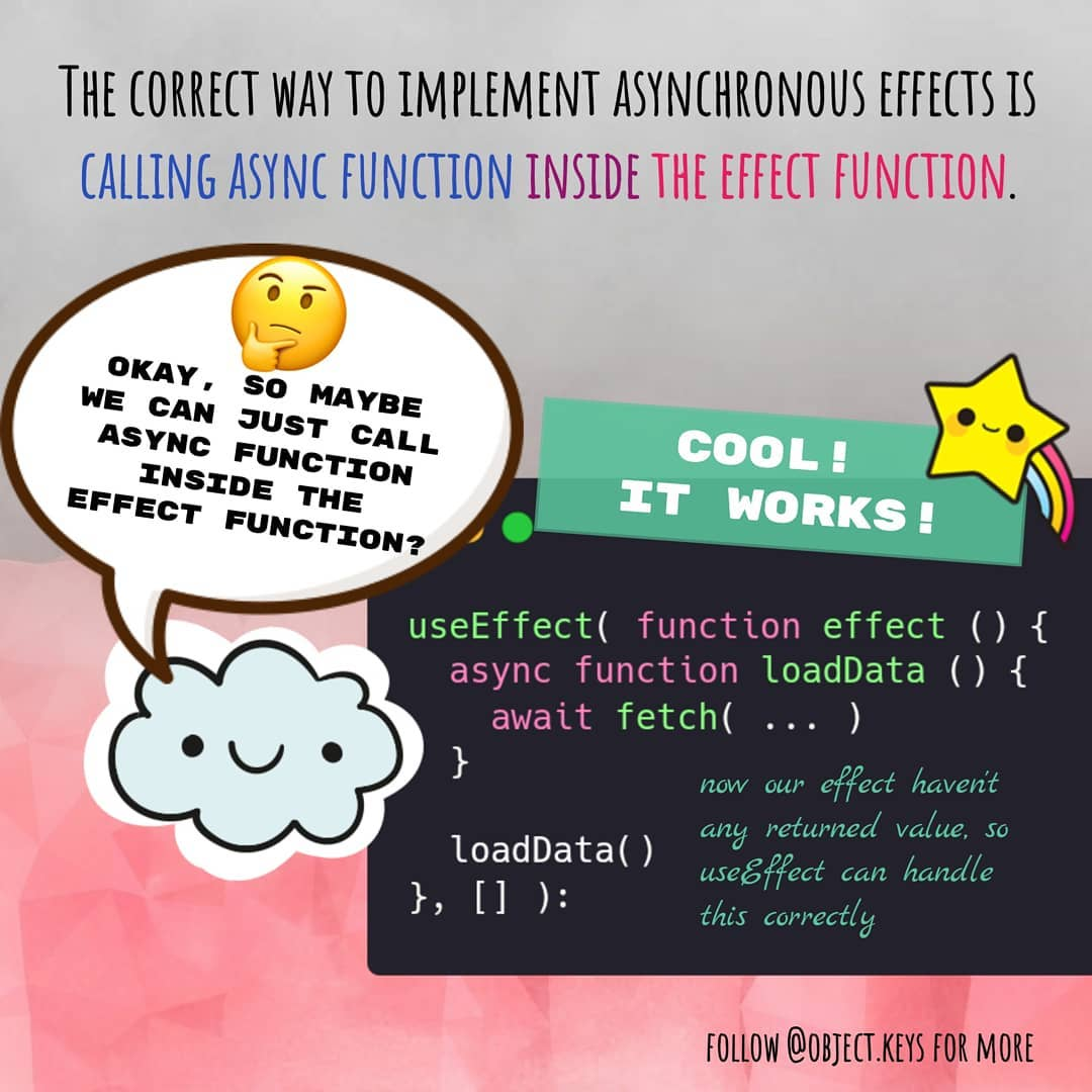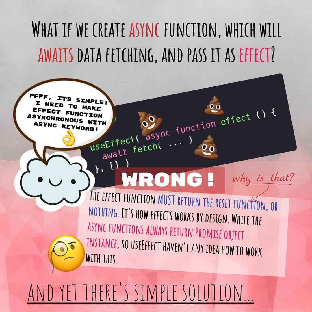 Функция–эффект позволяет нам выполнять асинхронный код, но будьте внимательны — в useEffect нельзя передавать async функцию напрямую!