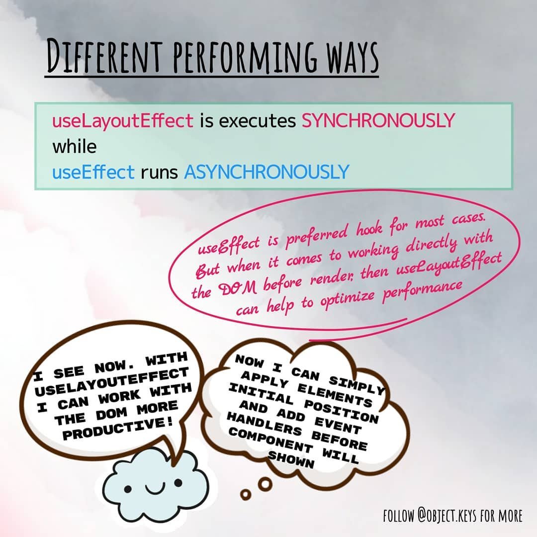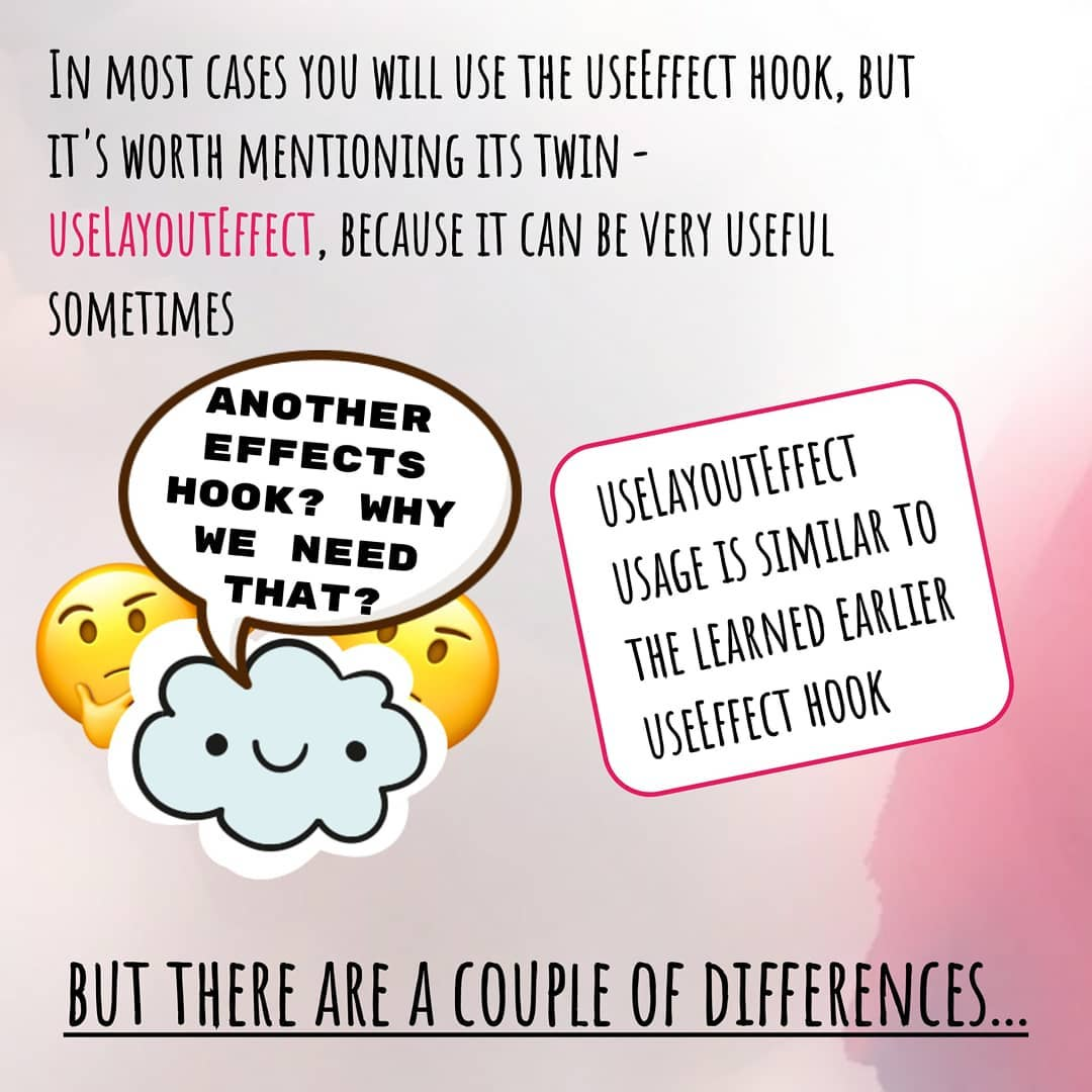 Этот хук также как и useEffect предназначен для вызова функций–эффектов, но между ними есть два существенных отличия: