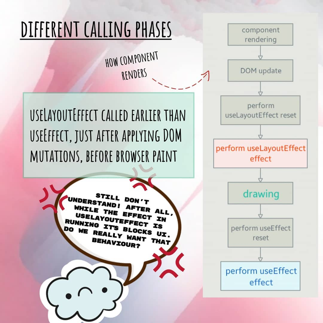 Поскольку useLayoutEffect синхронно выполняет функцию–эффект до отрисовки – он может задерживать отображение интерфейса.