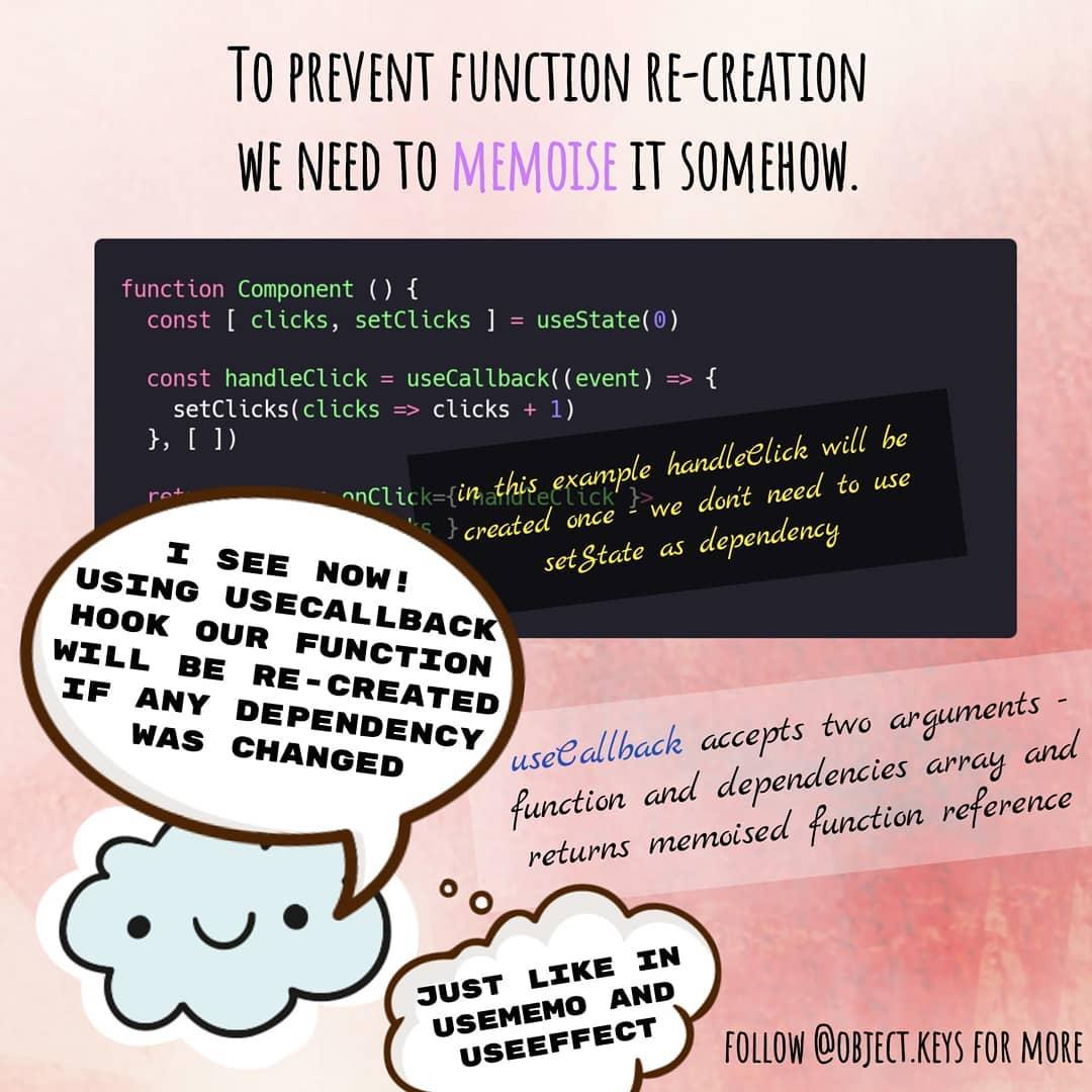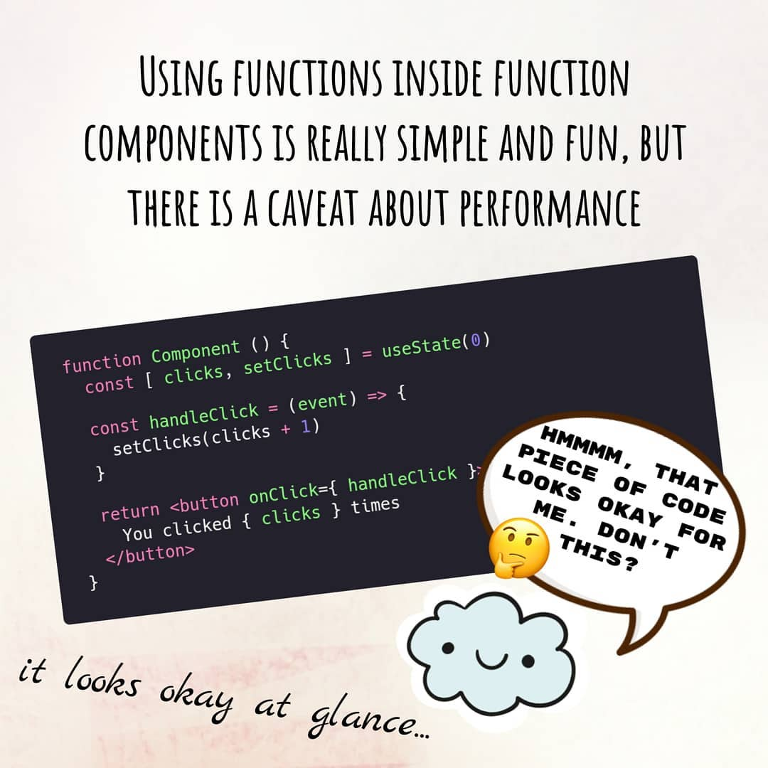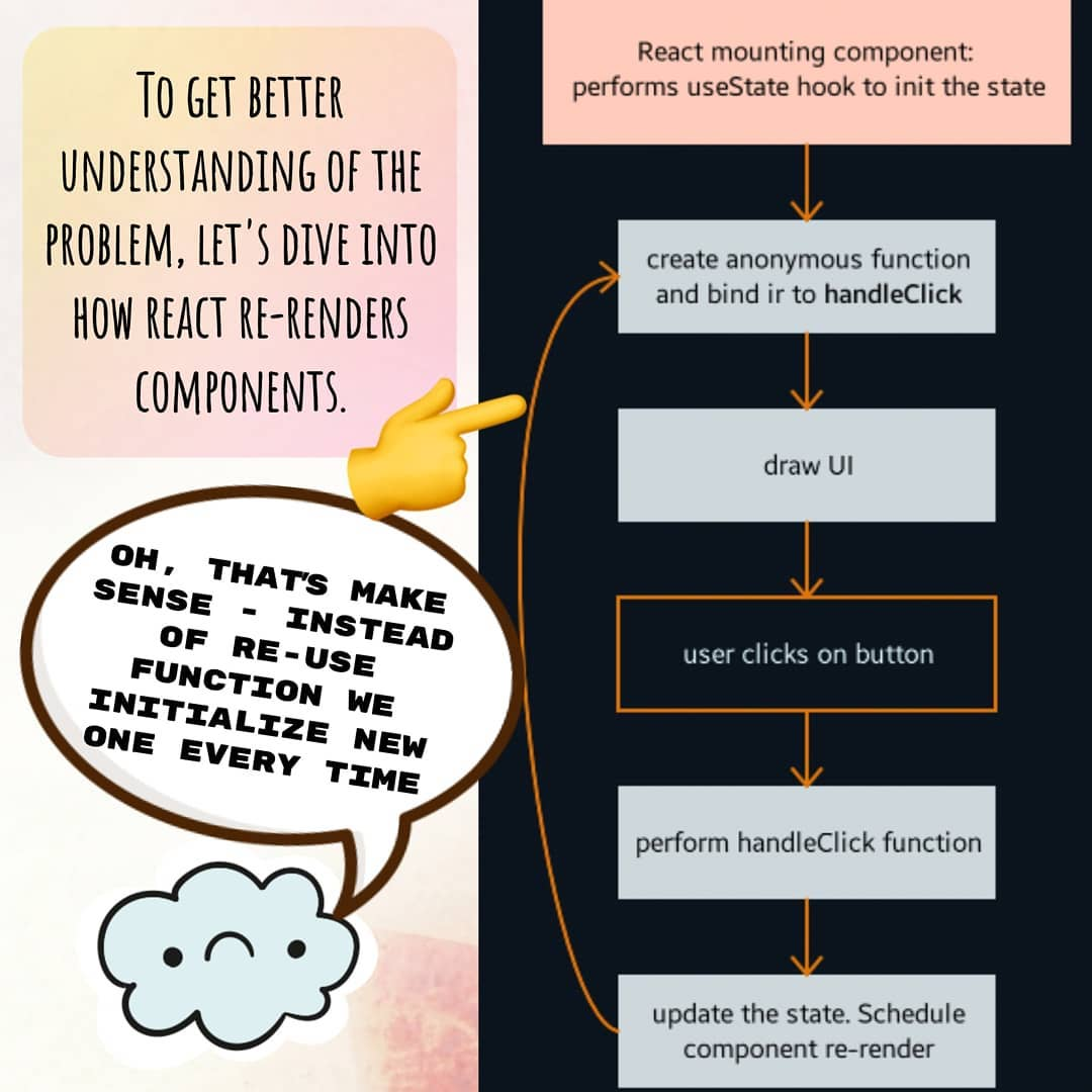 В простейшем случае, все функции, которые мы объявляем внутри компонента будут пересоздаваться при каждом рендере. Само по себе это явление не несёт в себе большой оверхед по производительности, однако, если мы передаём эти функции в качестве пропсов — они могут вызывать ререндер дочерних компонентов при ререндере родительского.