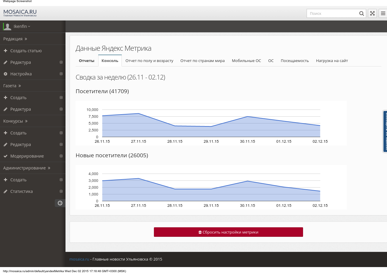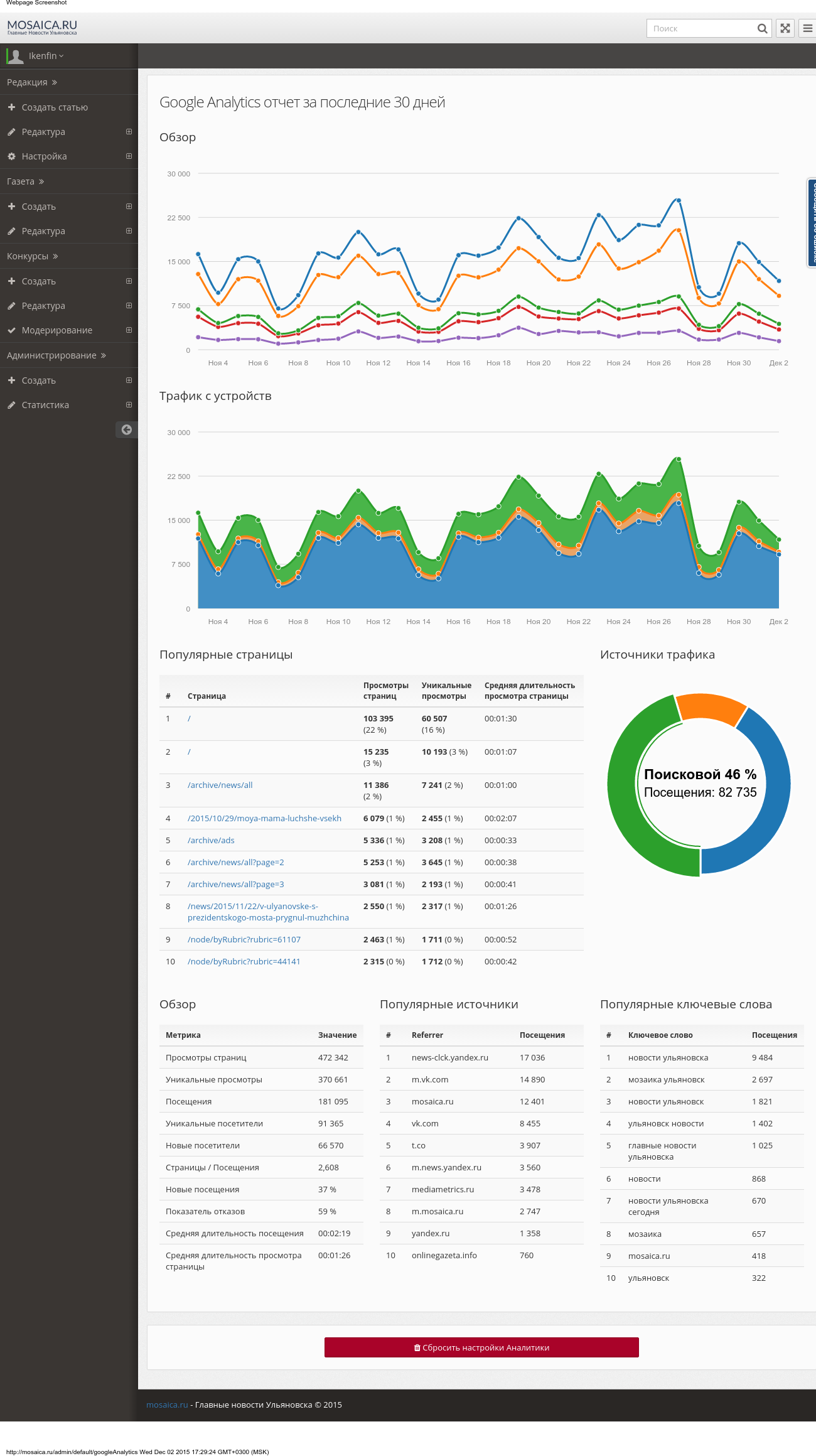 Вообще по части переиспользования кода, mosaica_v1.5 - рекордсмен среди наших проектов. Например, механизм отложенной публикации и резак изображений в усовершенствованном виде перекочевали сюда из так и не увидевшего свет polit.mosaica, а генерация url и редактируемые шаблоны пришли из проекта ka73. Виджет для просмотра информации из Яндекс.Метрики является адаптированным под Yii плагином Wordpress, а информер Google Analytics был выдран из модуля Ycm.